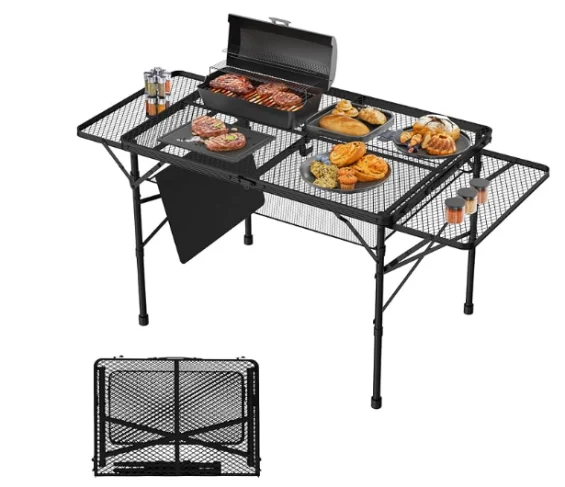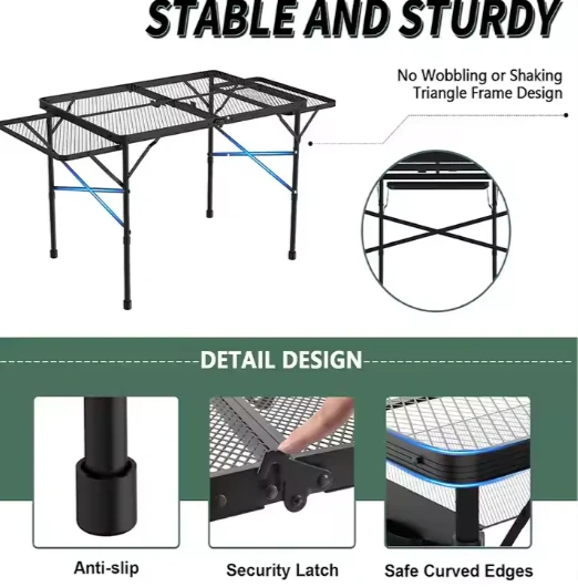 Lydinio kempingo stalas lauko sulankstomas stalas, sulankstomas stalas su 2 sparnų plokštėmis, 3x2 pėdų stovyklavietės stalas su tinklelio darbalaukiu, reguliuojamo sulankstomo grotelių stalo aukštis
