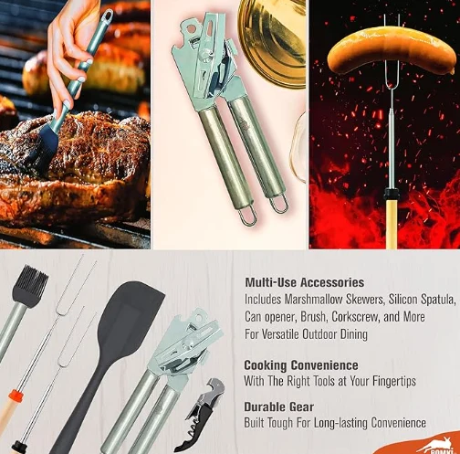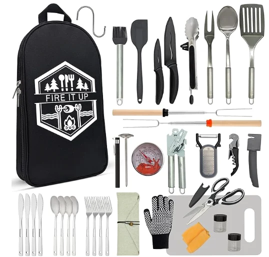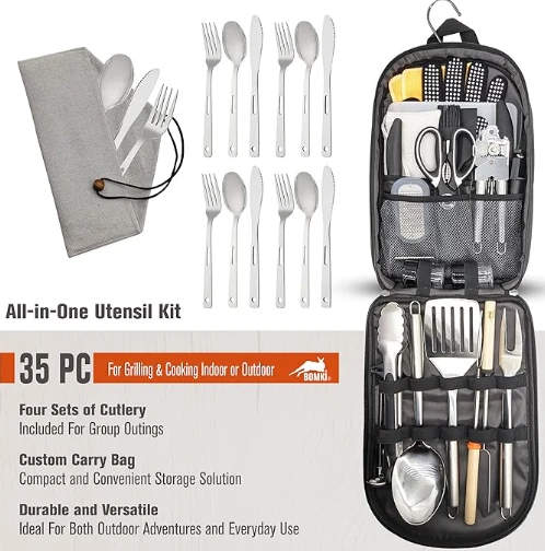 Lauko kempingų virtuvės reikmenų laikymo krepšys Šis 35 kompiuterių kempingų virimo indų rinkinys yra išsamus jūsų lauko maisto gaminimo poreikių sprendimas. Tai apima kempingo virtuvės komplektą ir kempingų indų virimo komplektą, visi tvarkingai supakuoti į pasirinktinį krepšį su papildomais skyriais ir dviem užpakalinėmis kišenėmis. Rinkinys yra skirtas patenkinti visus jūsų kempingo maisto gaminimo būtiniausius daiktus, todėl tai yra nepakeičiamas jūsų kempingo įrankių papildymas