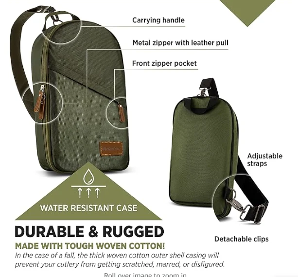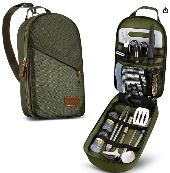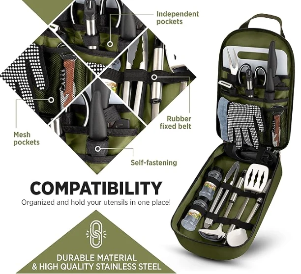 Nešiojamasis lauko kempingo įrankių krepšys, kiekvienas indas turi savo nurodytą maišelį, todėl vienetai nesikiša, subraižyti ar pažeisti laikyme ar tranzitu. Suteikia lengvą prieigą